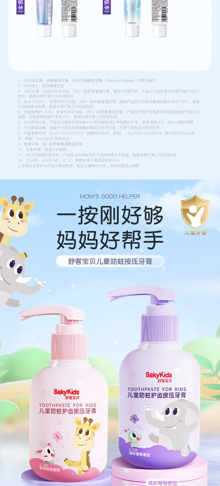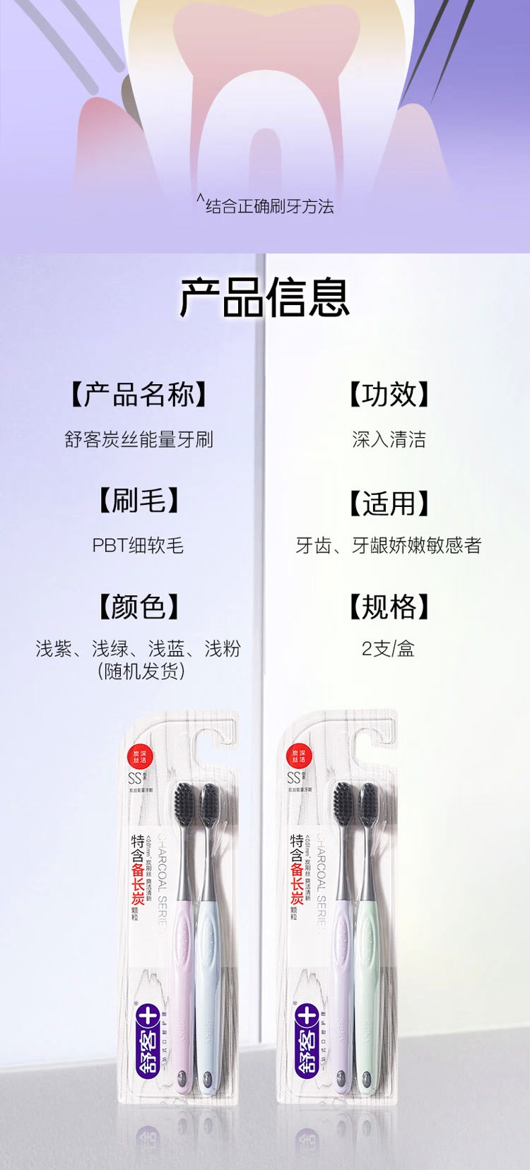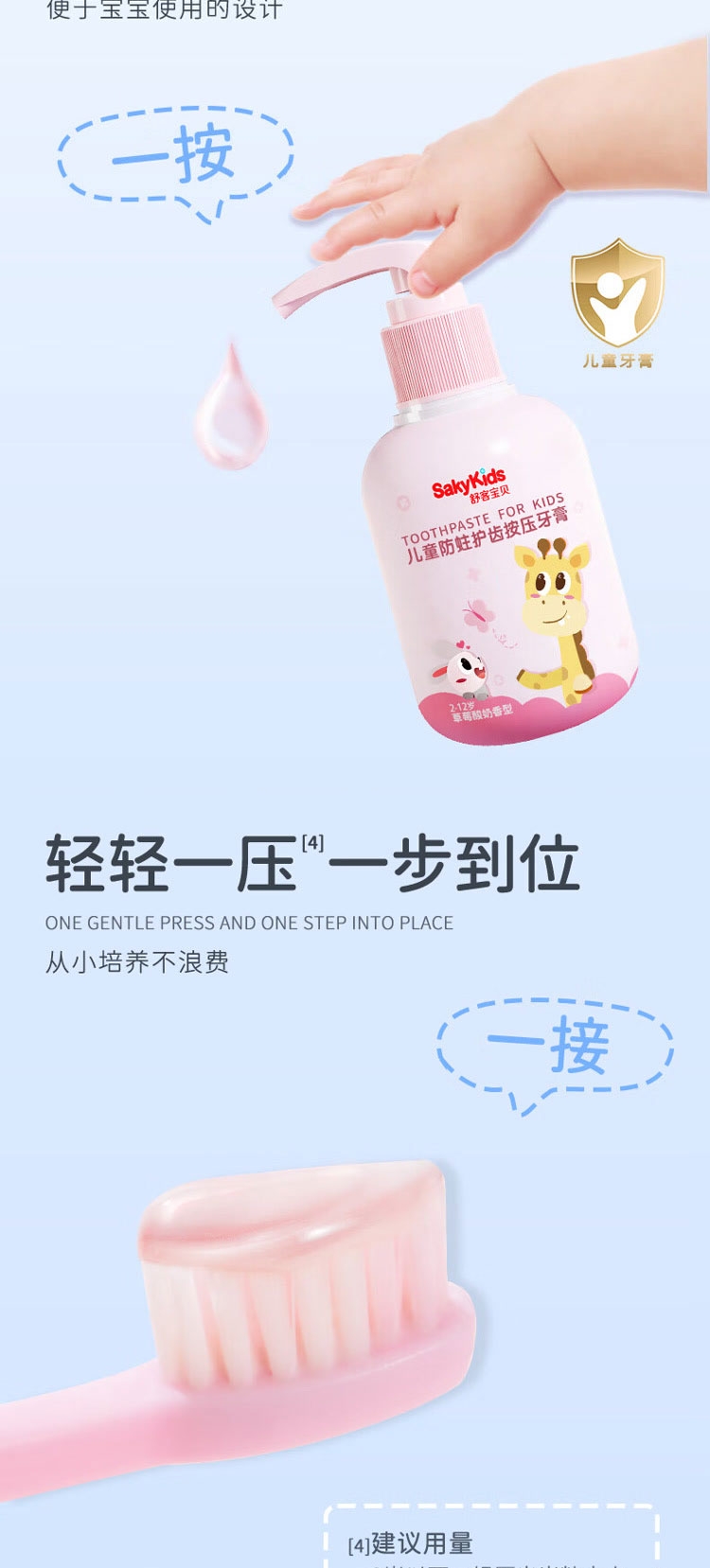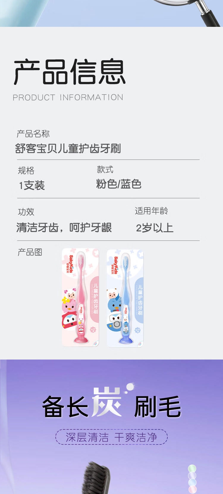 甄选法国天然酵素&谷物提亮精华,温和去渍;深层洁净,干爽清新:特含备长炭颗粒,令刷毛干爽洁净;专为儿童研发防蛀牙膏,150g按压式设计,防蛀护齿;舒客宝贝护齿牙刷,柔软刷毛呵护牙龈,小巧刷头深入清