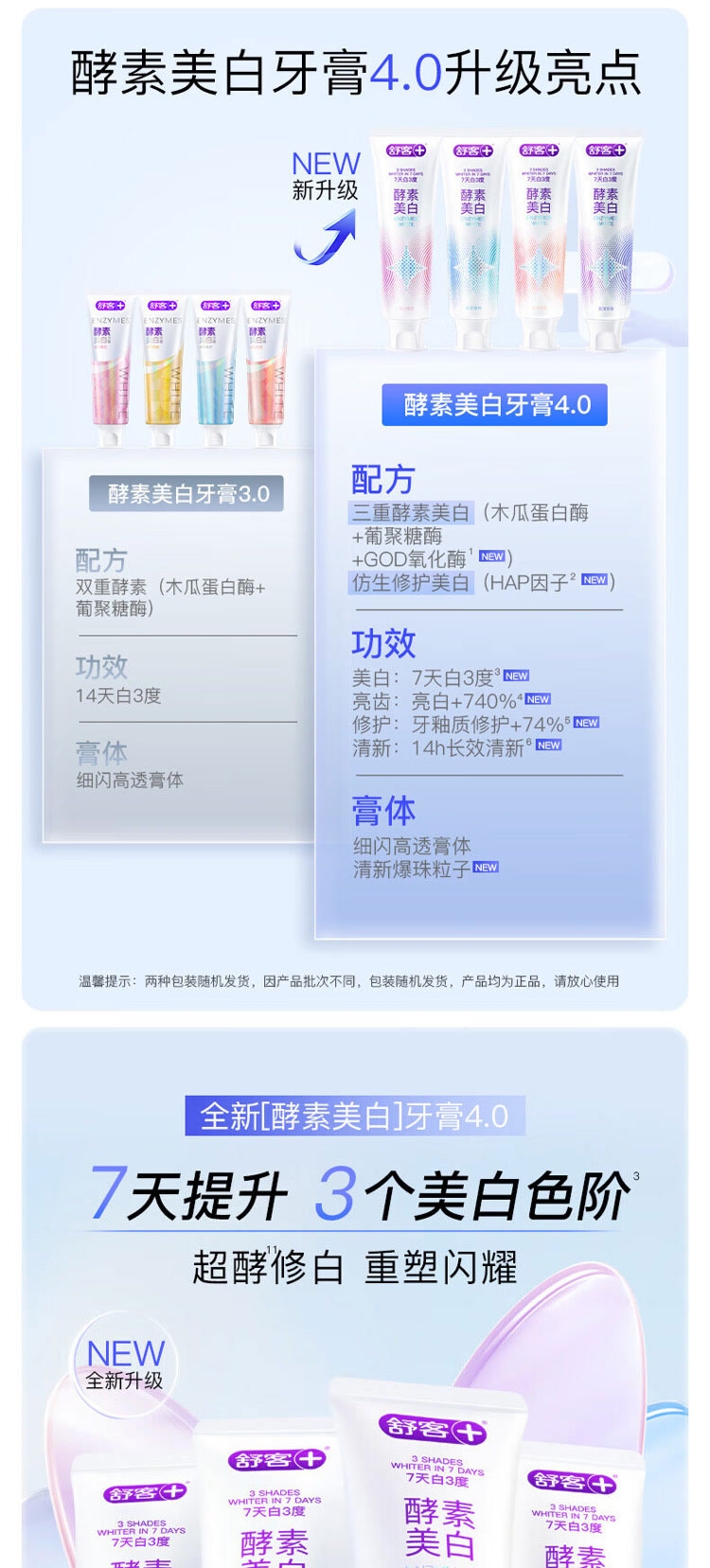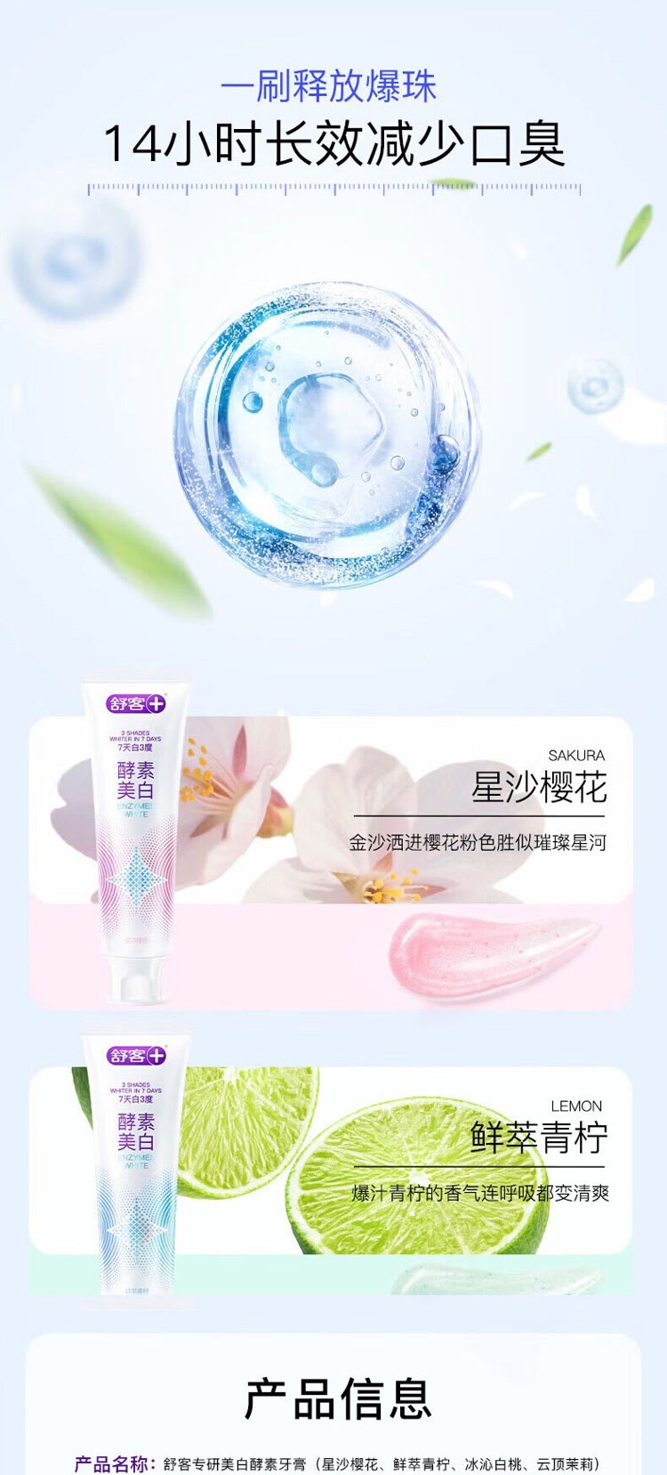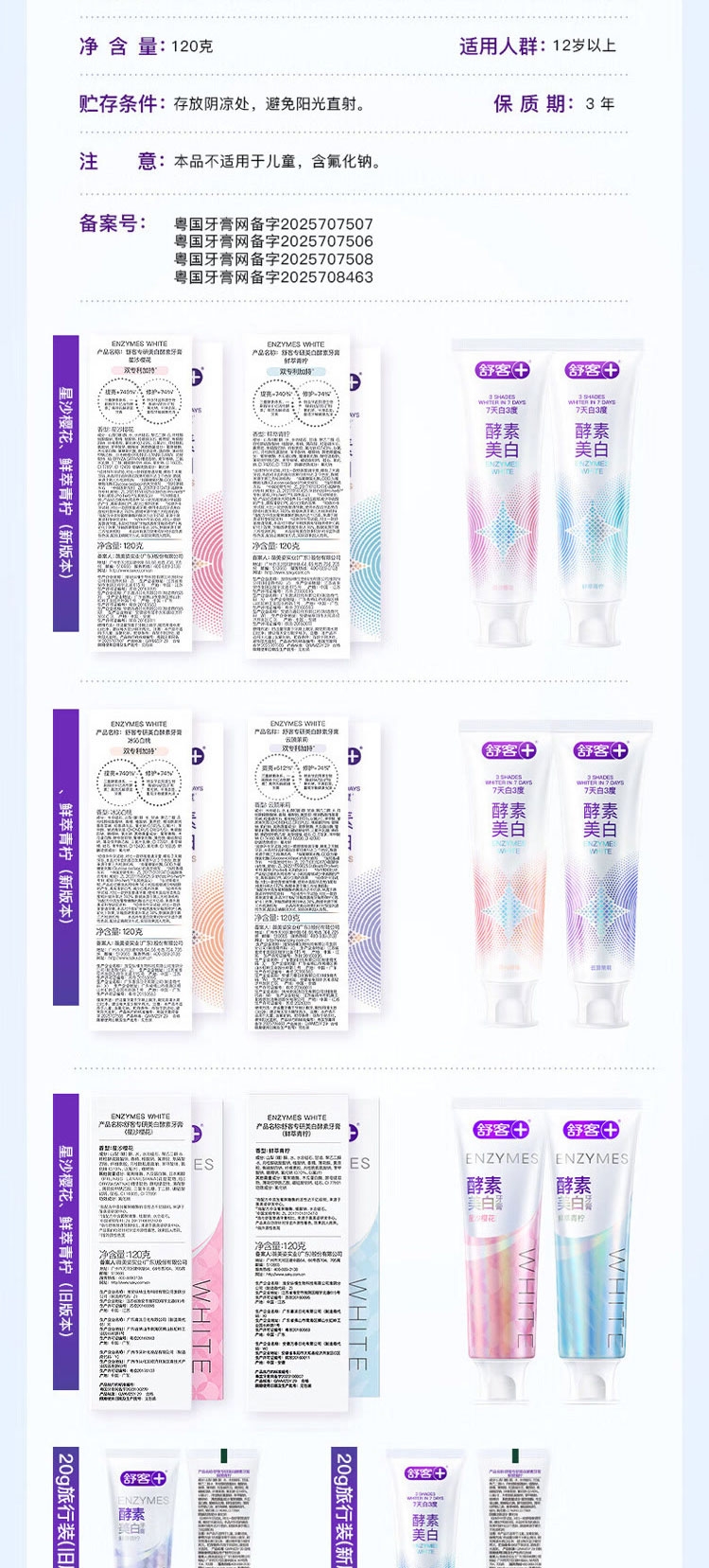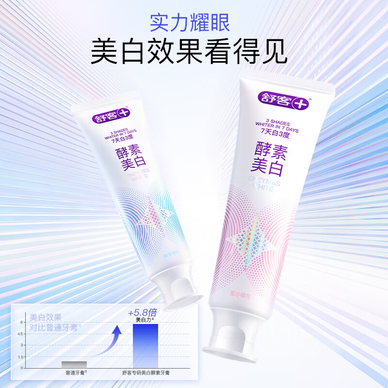 配置清单:舒客宝贝儿童防蛀护齿按压牙膏150g(草莓味)*1支 舒客宝贝儿童防蛀护齿按压牙膏150g(葡萄味)*1支 舒客宝贝儿童护齿牙刷*1支(蓝色/粉色随机) 舒客专研美白酵素牙膏(星沙樱花)120g*1支 舒客专研美白酵素牙膏(鲜萃青柠)120g*1支 舒客炭丝能量牙刷*2支 赠送礼品袋*1个