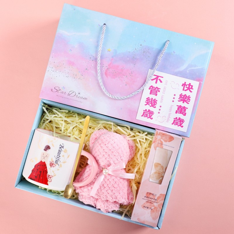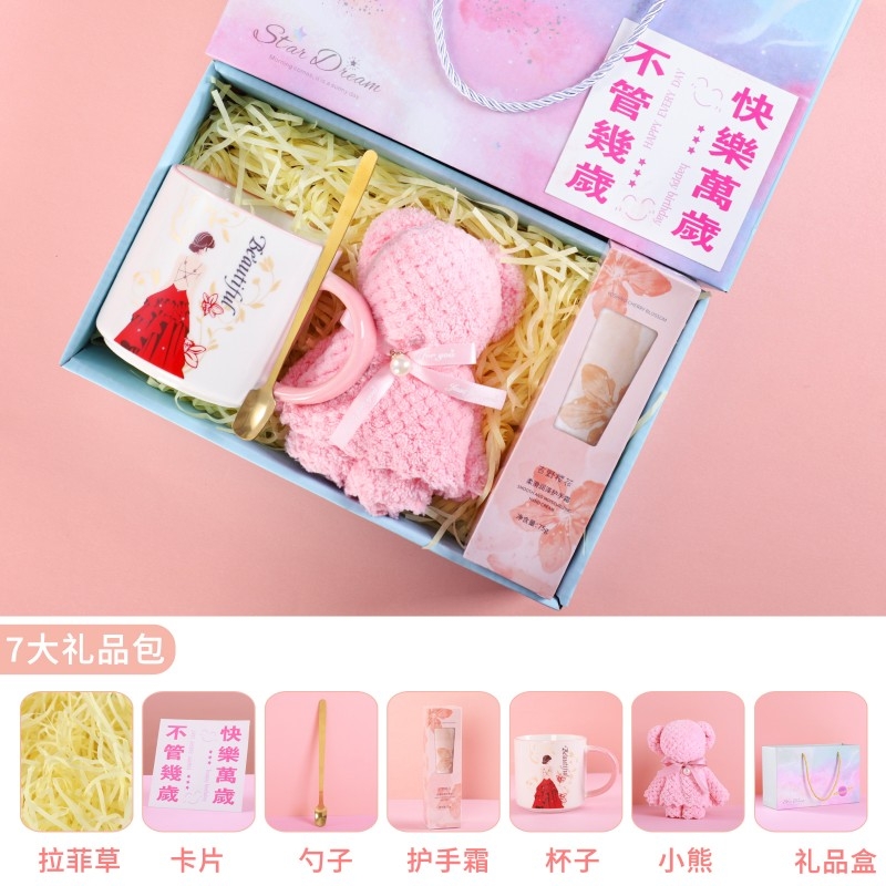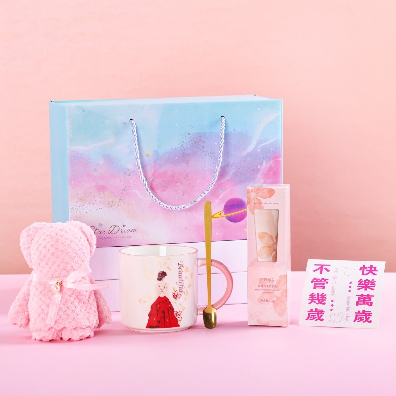 配置清单:陶瓷杯、搅拌勺、小熊毛巾 、护手霜、拉菲草、手提礼盒