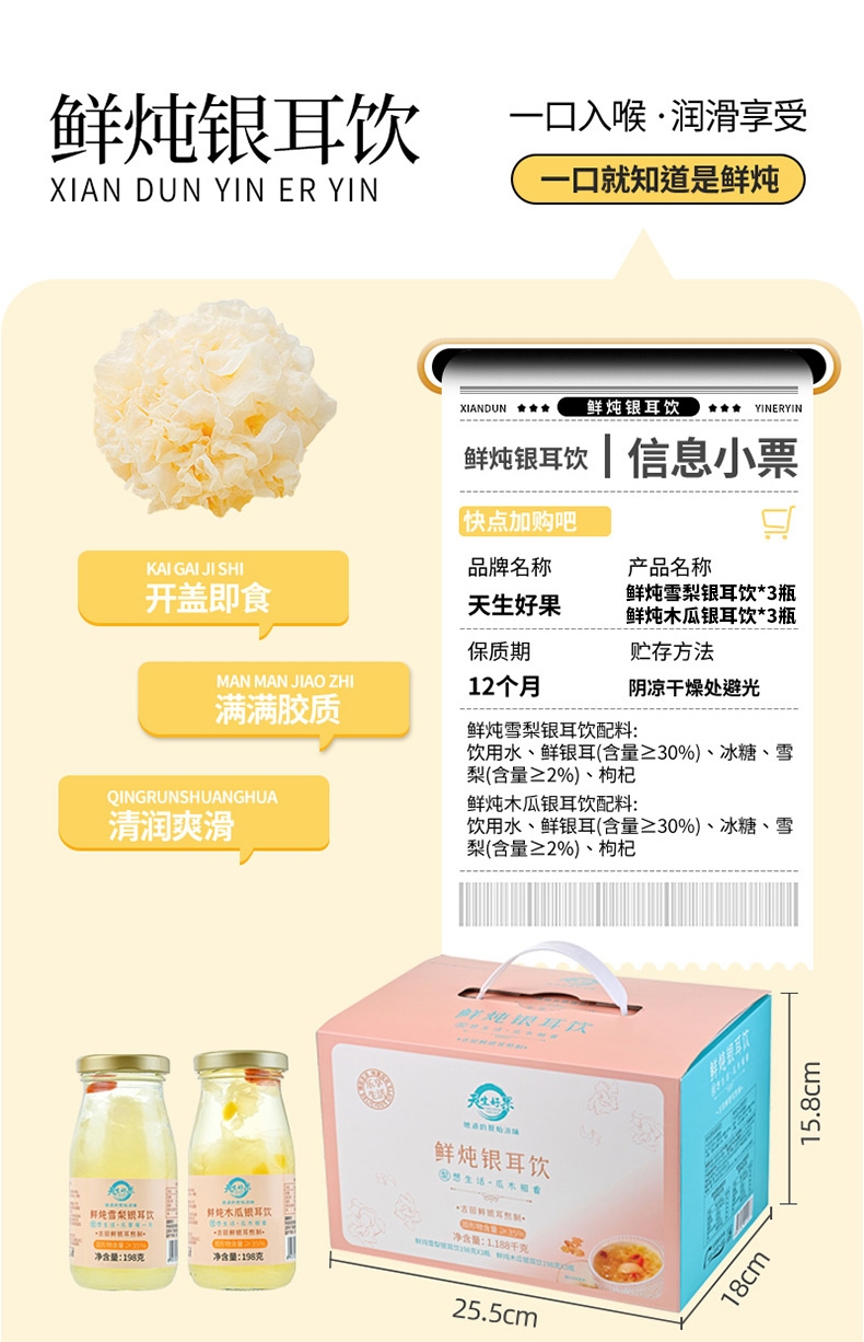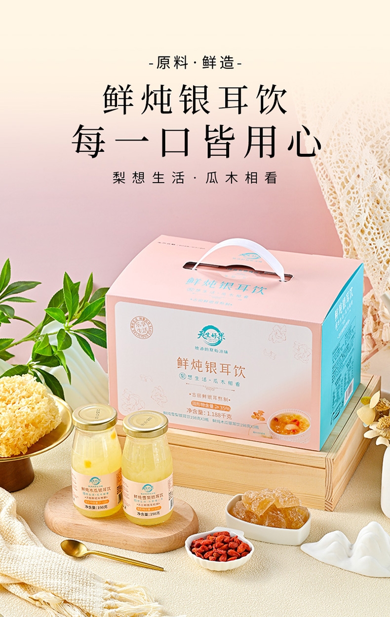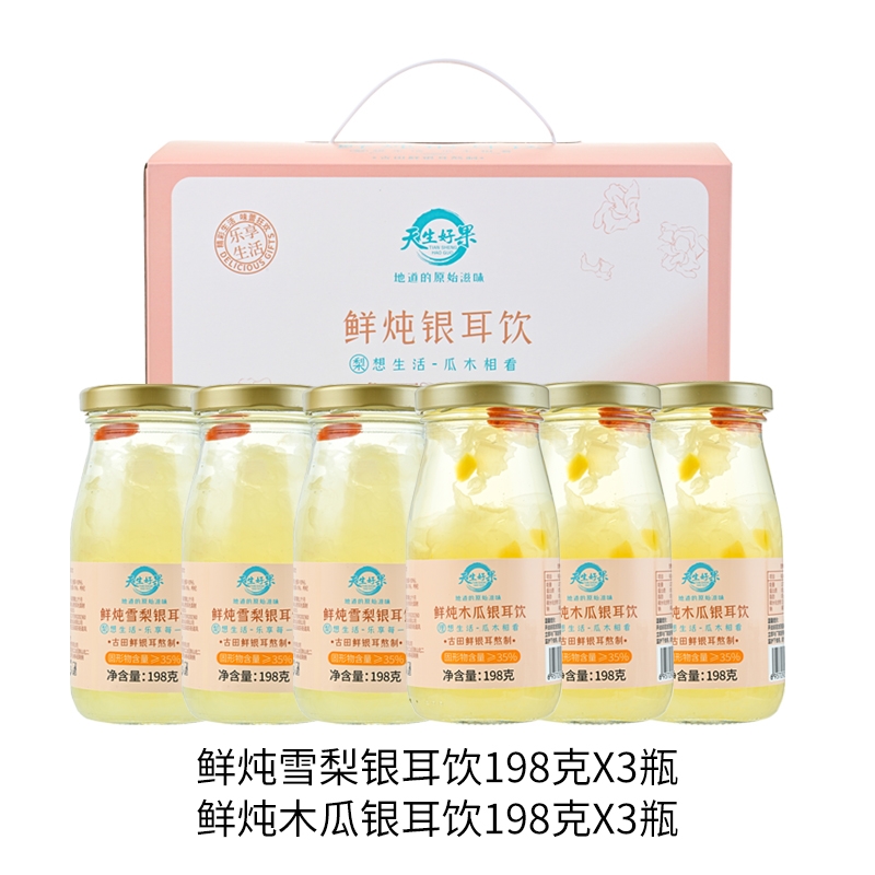 内配:鲜炖雪梨银耳饮198克*3瓶 鲜炖木瓜银耳饮198克*3瓶