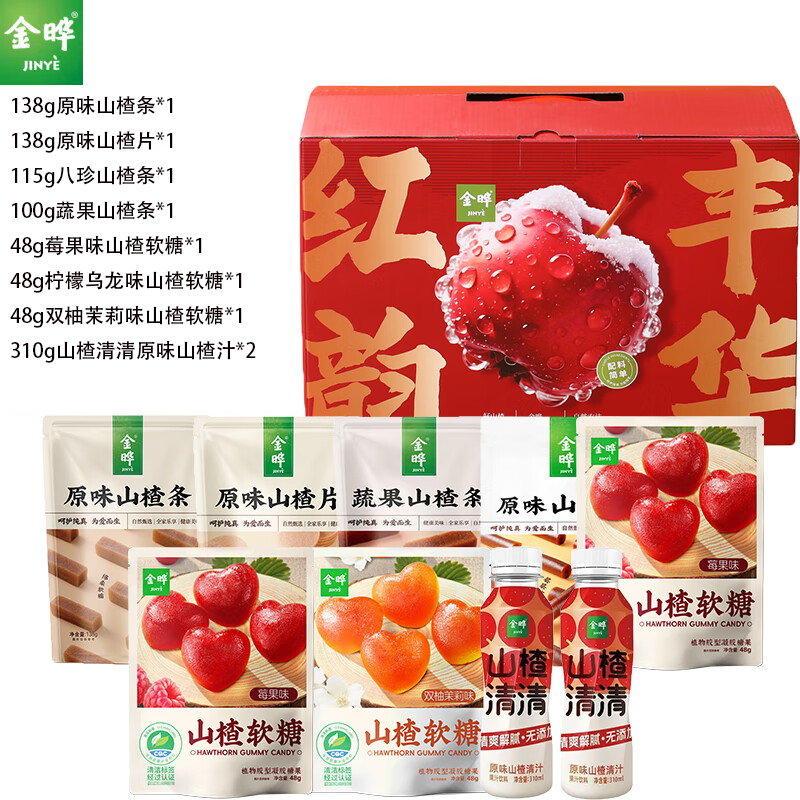 配置:138g原味山楂条*1 138g原味山楂片*1 115g八珍山楂条*1 100g蔬果山楂条*1 48g莓果味山楂软糖*1 48g柠檬乌龙味山楂软糖*1 48g双柚茉莉味山楂软糖*1 310g山楂清清原味山楂汁*2