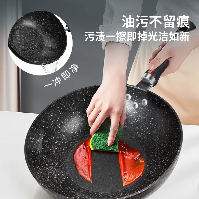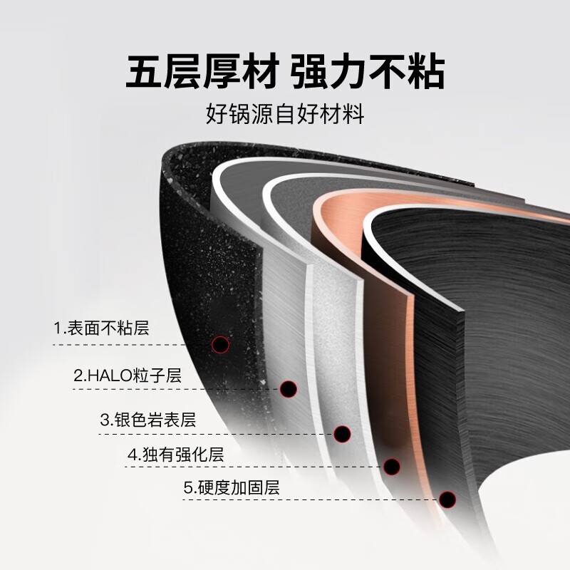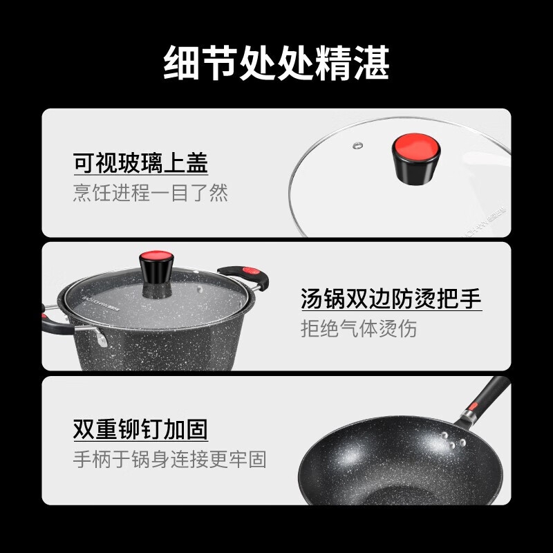 不易粘稠,导热均匀,不易产生局部高温;可视锅盖,随时跟进烹饪过程;手柄挂钩设计,高效隔热,防滑,节约空间
