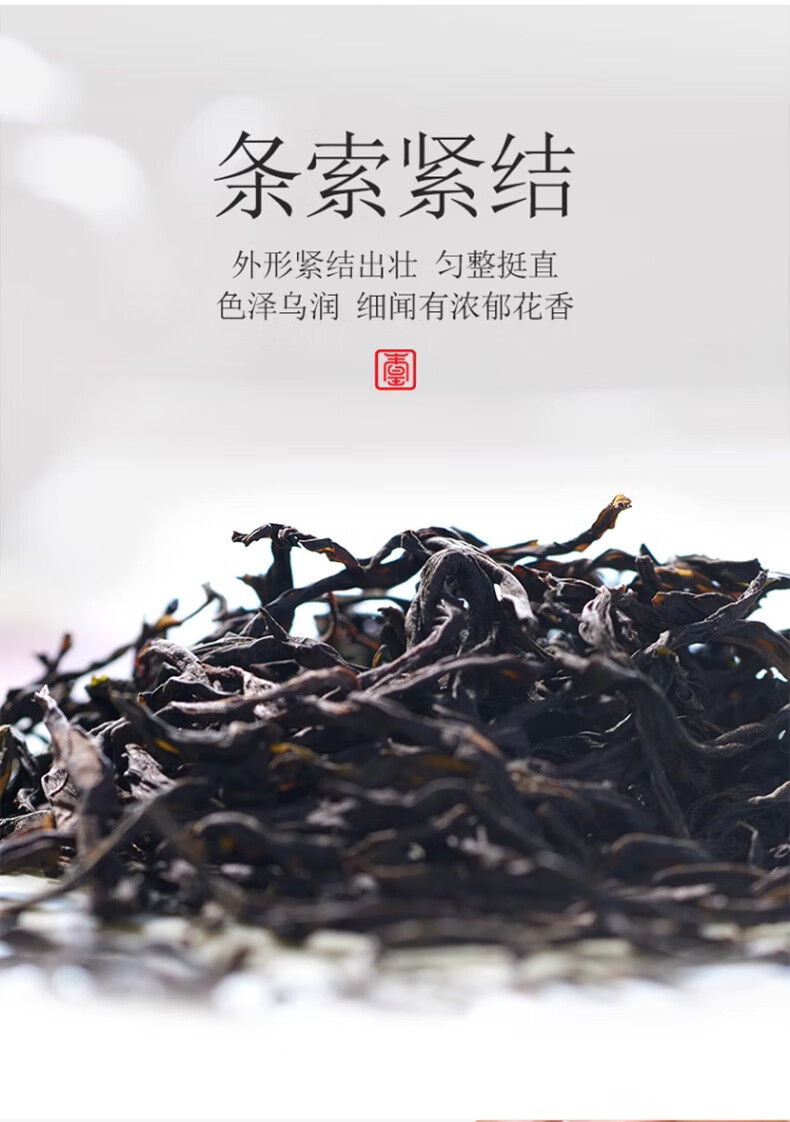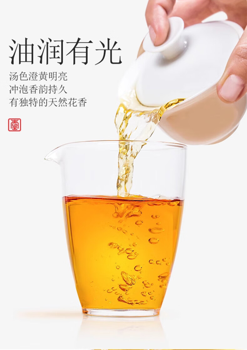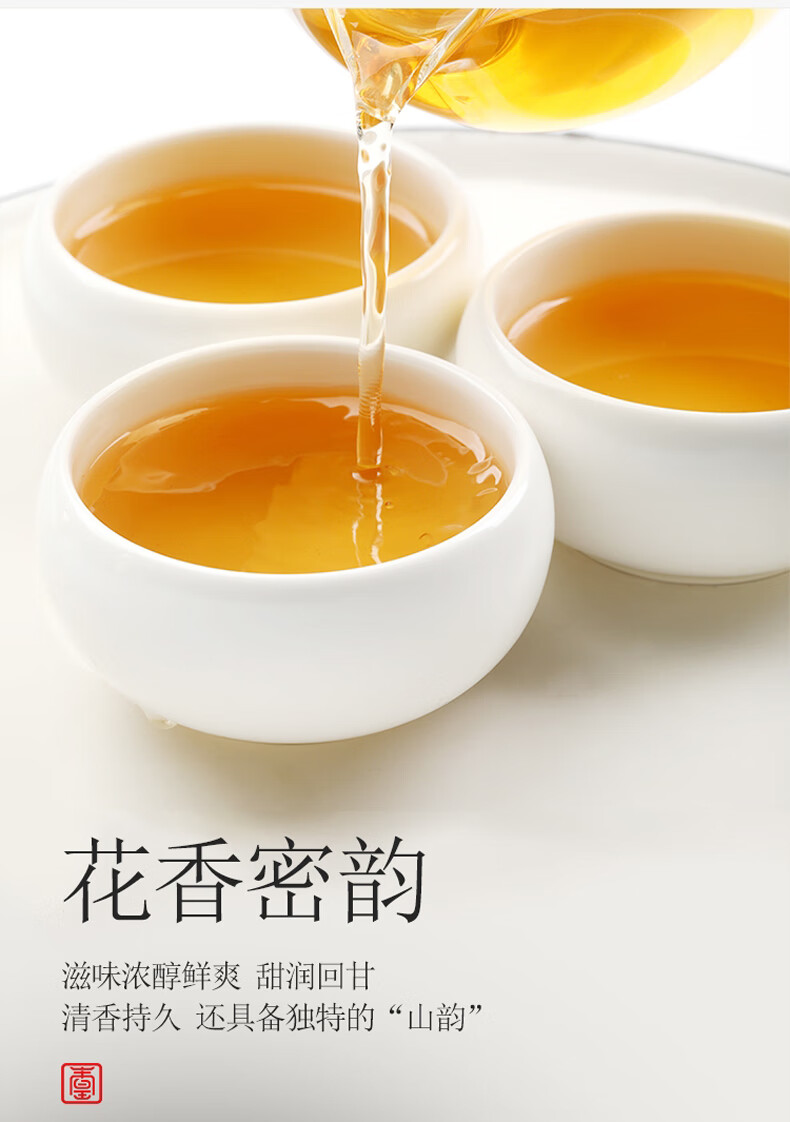 条索紧结,芽叶匀整,色泽乌润;花香、果香、蜜香,兰韵、陈香馥郁,层次丰富;汤感金黄透亮,入口甘醇,蜜韵悠长