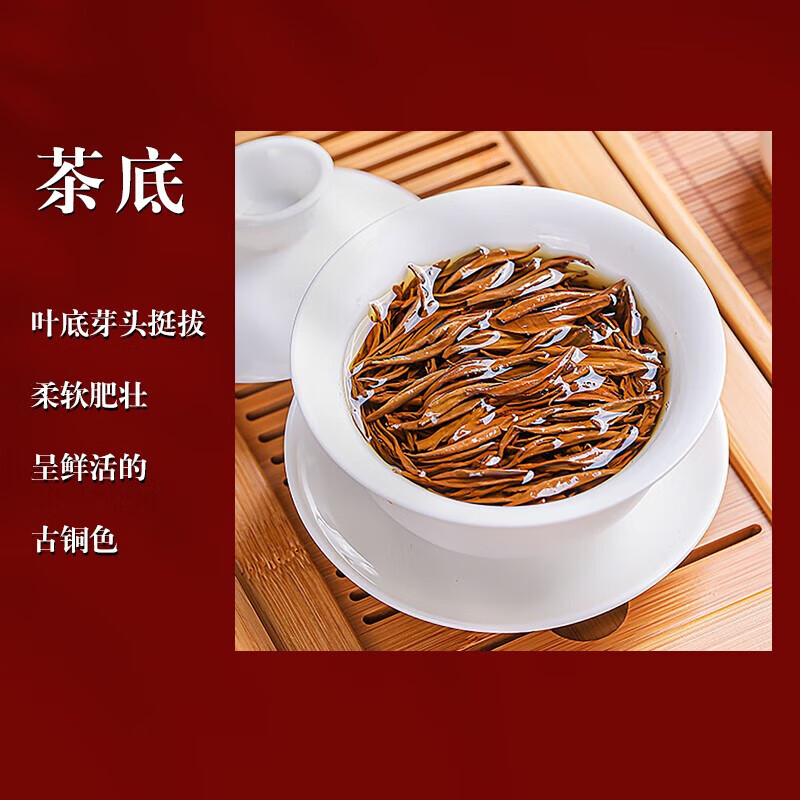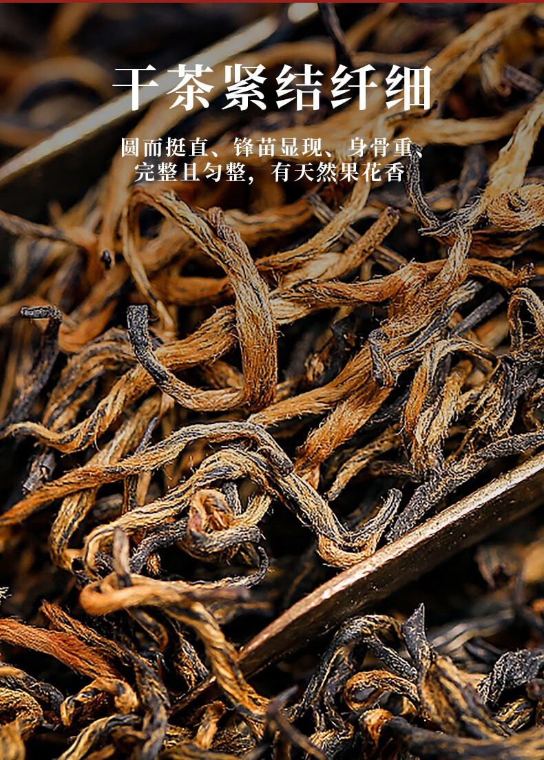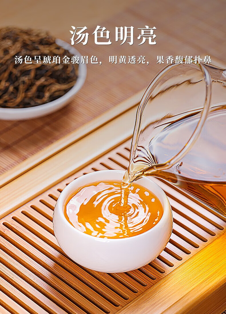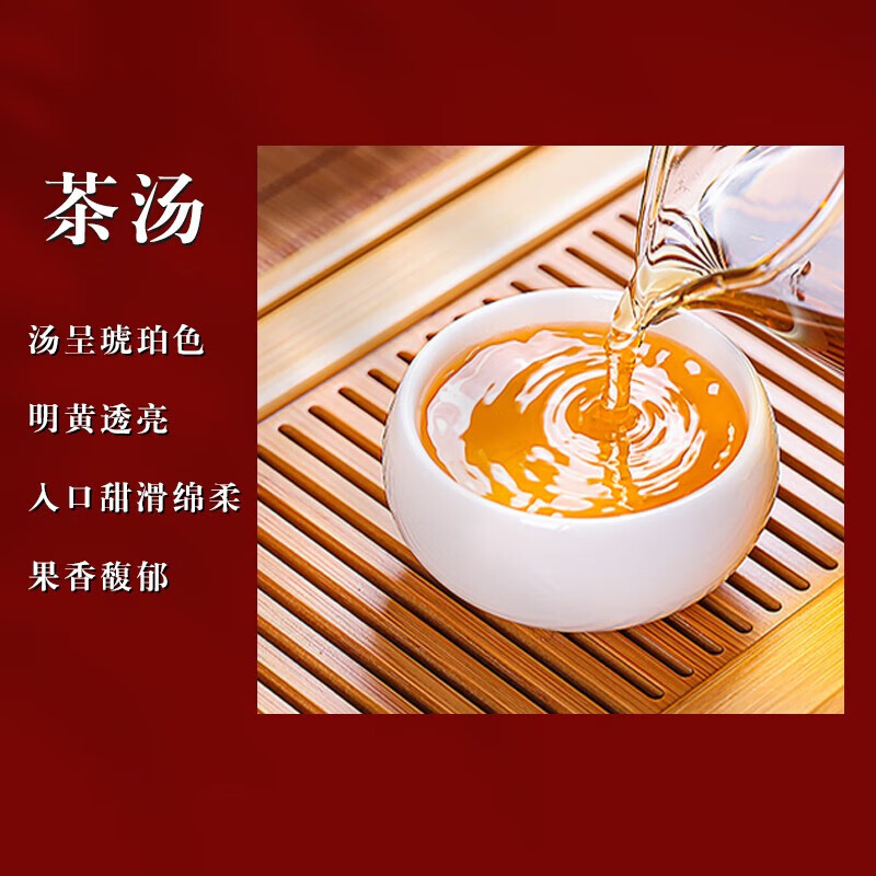 金毫显著,形似眉毛,叶芯金黄莹亮;金黄透亮,如色拉油般晶莹;天然甜香,带有花果香(如蜜桃、桂圆),清雅馥郁