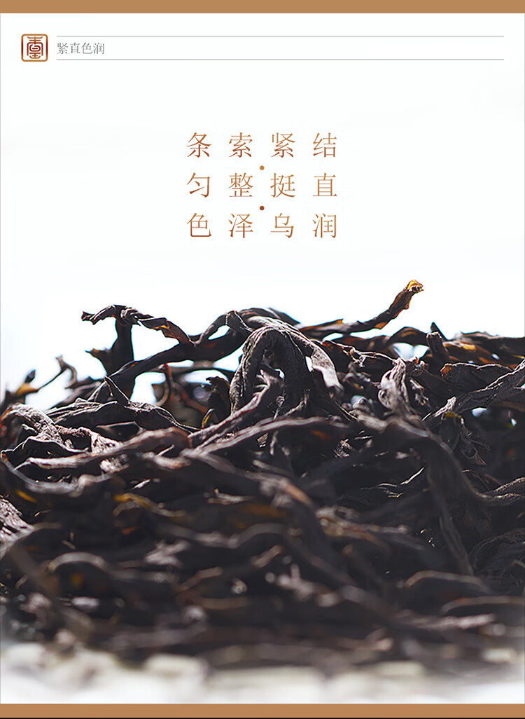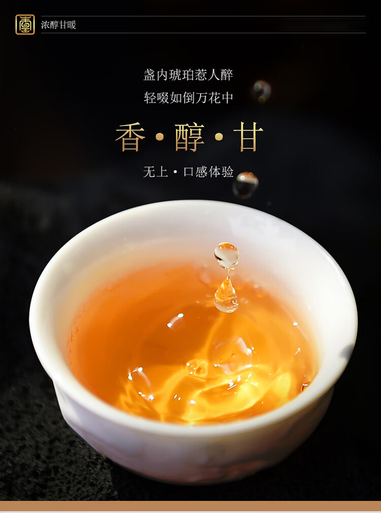 条索紧结,芽叶匀整,色泽乌润;花香、果香、蜜香,兰韵、陈香馥郁,层次丰富;汤感金黄透亮,入口甘醇,蜜韵悠长,柔滑细腻