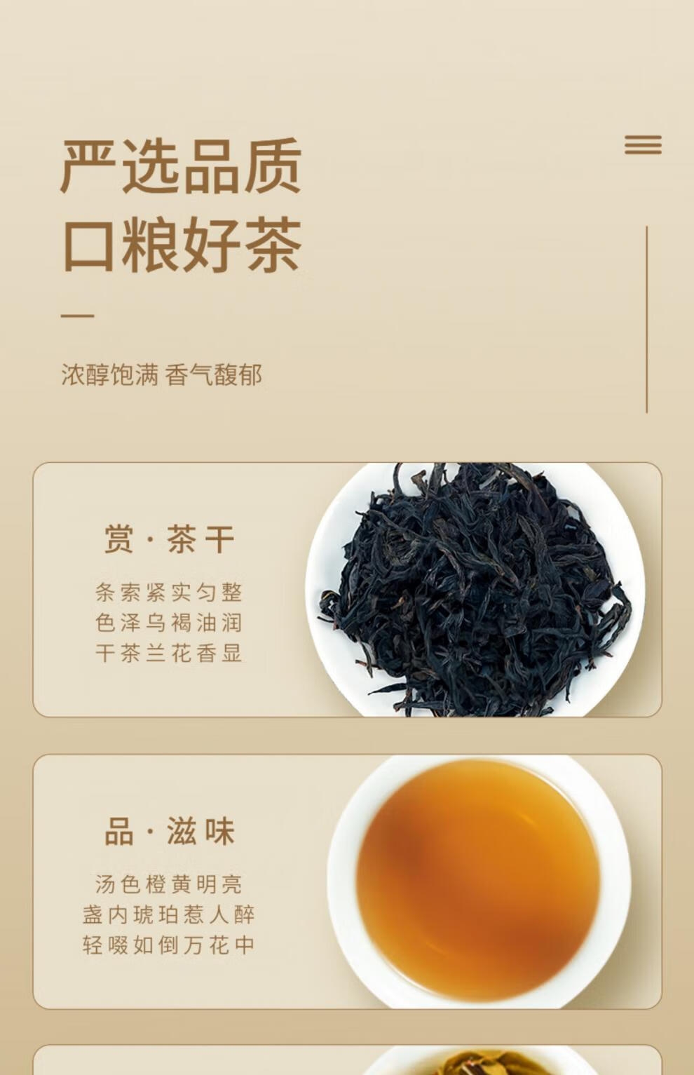 条索紧结壮直,肥硕匀整;高锐纯净,花香、果香、蜜香交织;花香清透,汤色浅黄