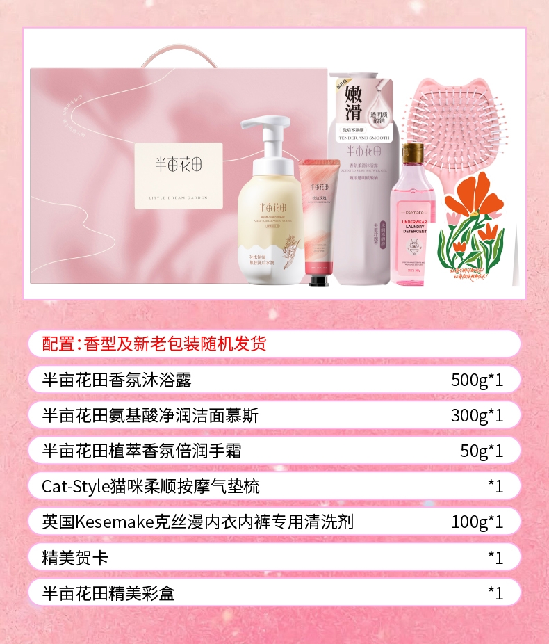 配置清单:半亩花田香氛沐浴露500g*1 半亩花田氨基酸净润洁面慕斯300g*1 半亩花田植萃香氛倍润手霜50g*1 Cat-Style猫咪柔顺按摩气垫梳*1 英国Kesemake克丝漫内衣内裤专用清洗剂100g*1 精美贺卡*1(量大可定制) 半亩花田精美彩盒ZS205*1