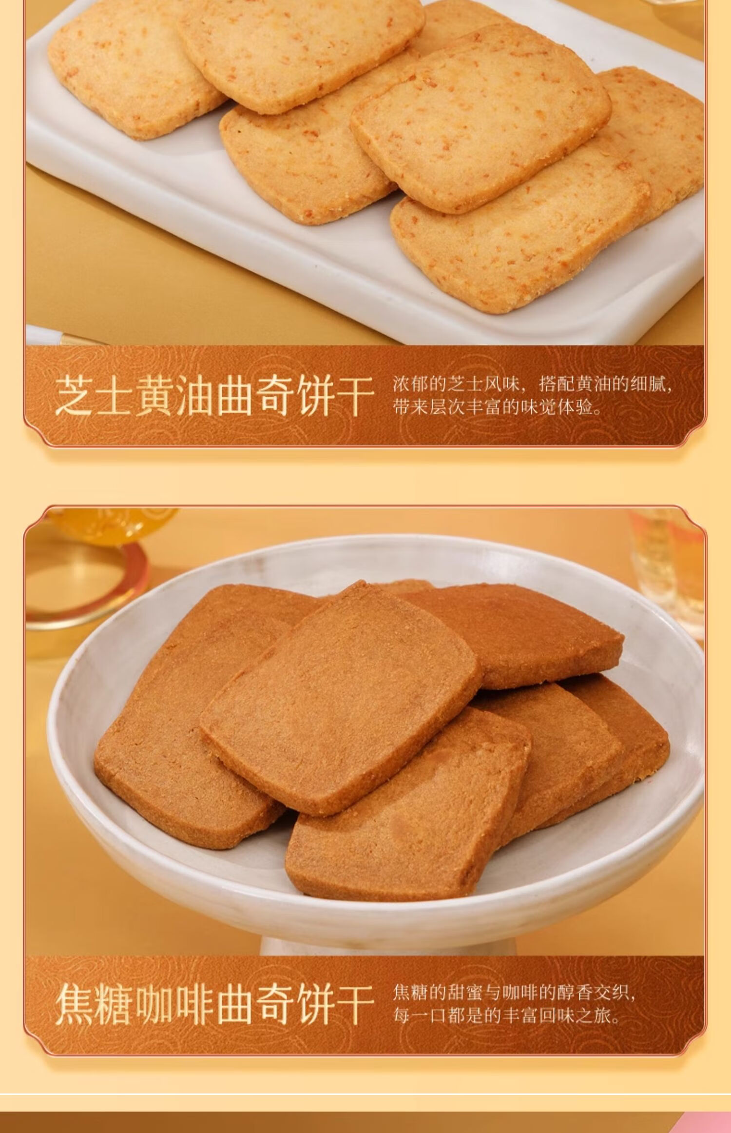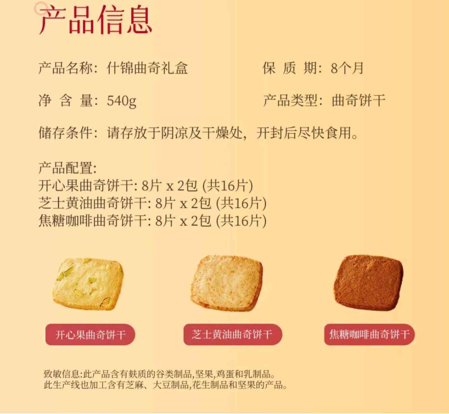 配置:开心果曲奇饼干:8片x2包(共16片)芝士黄油曲奇饼干:8片 x2包(共16片)焦糖咖啡曲奇饼干:8片x2包(共16片)