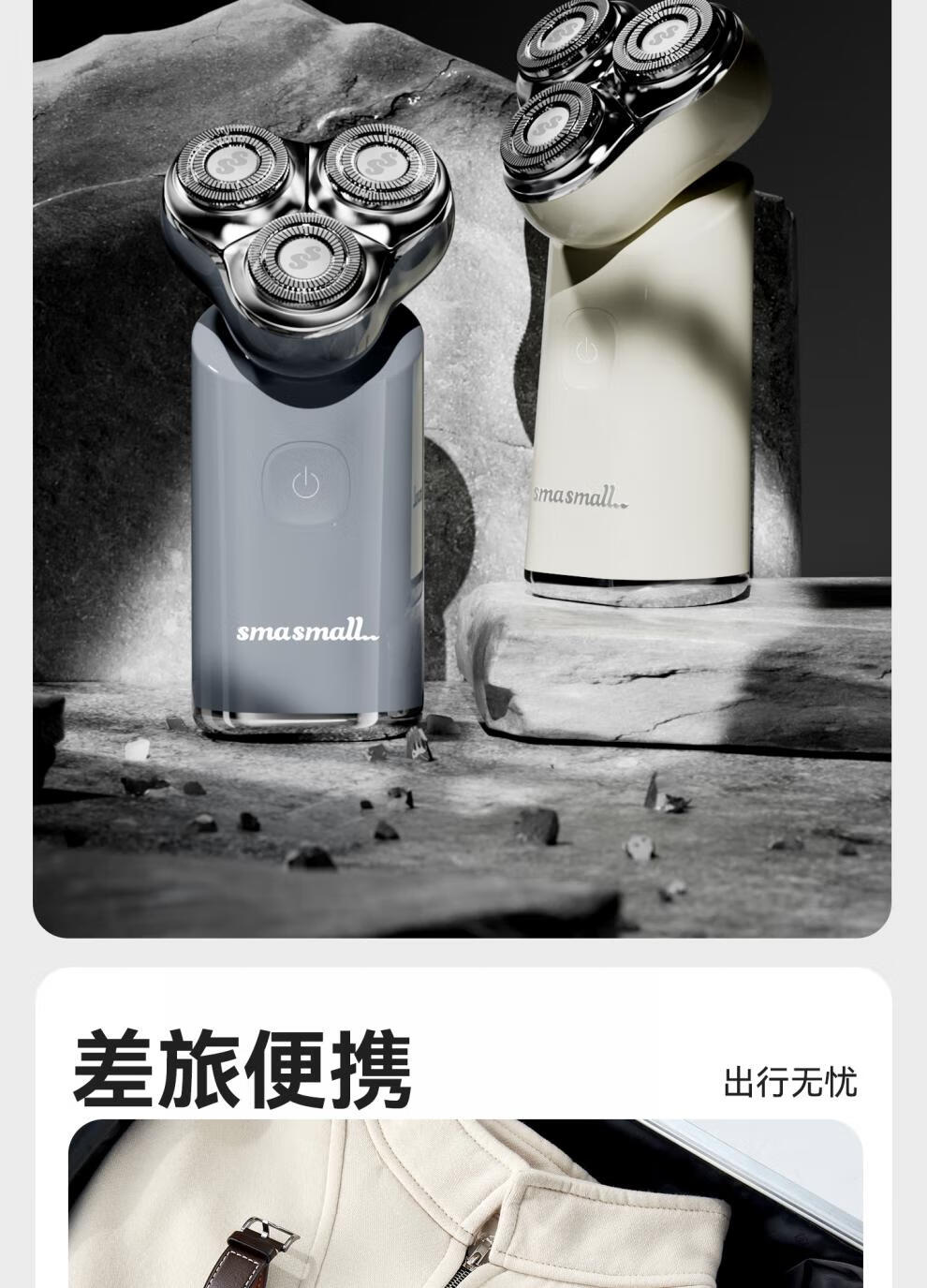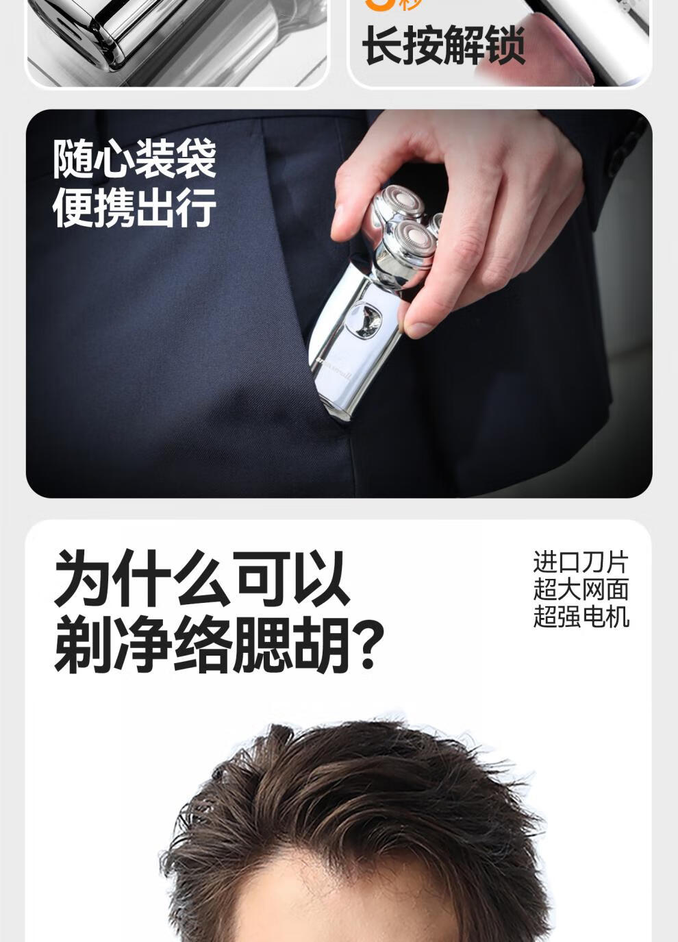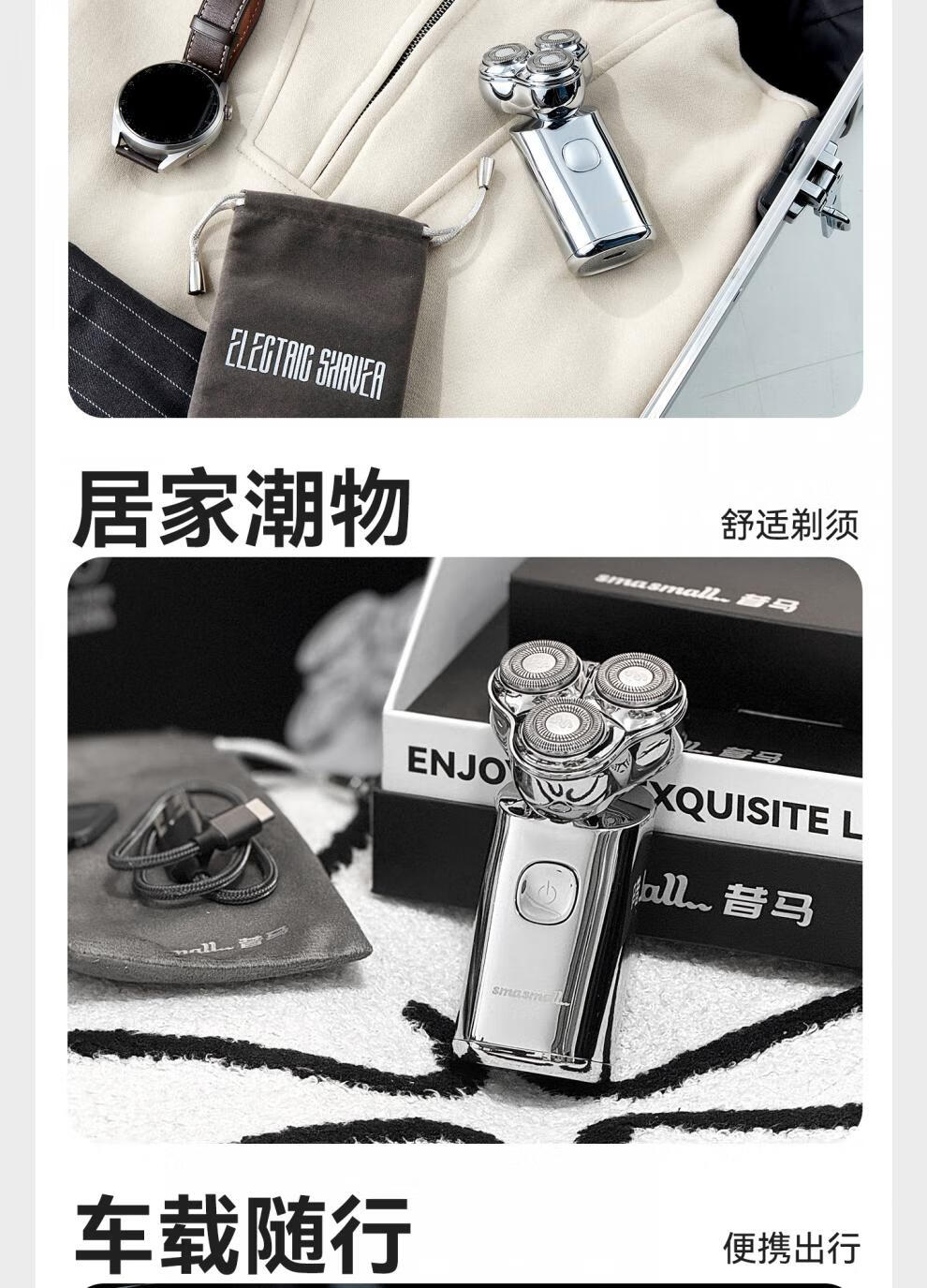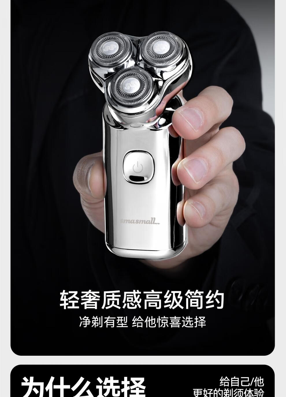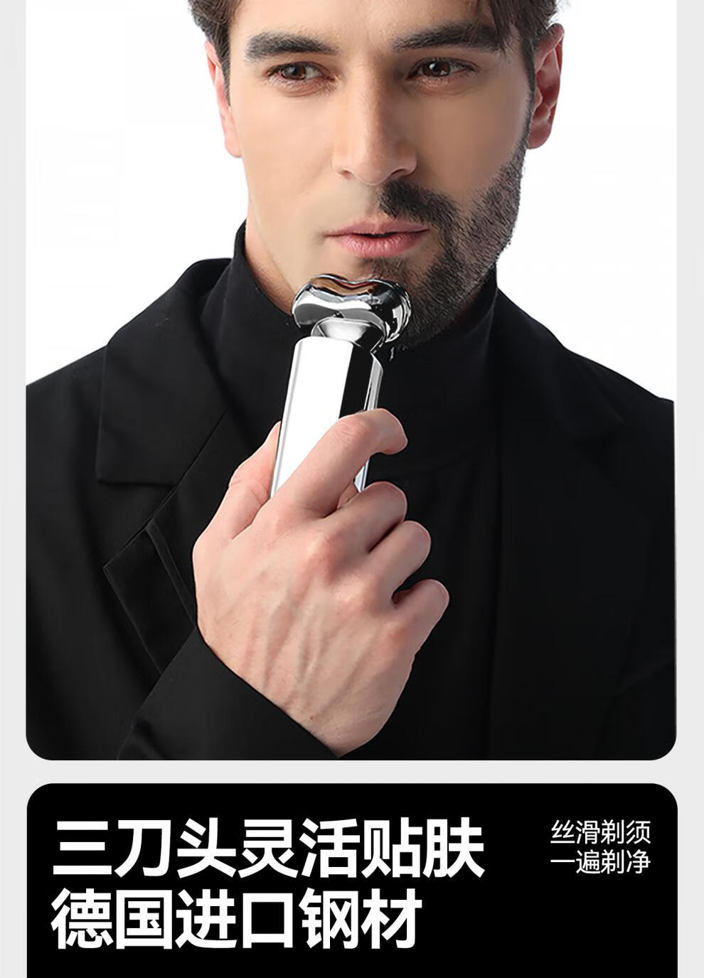 金属机身,一手握持;人体工学设计,贴合手动剃须角度;随心装袋,便携出行