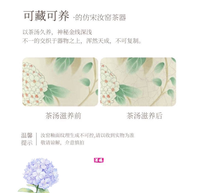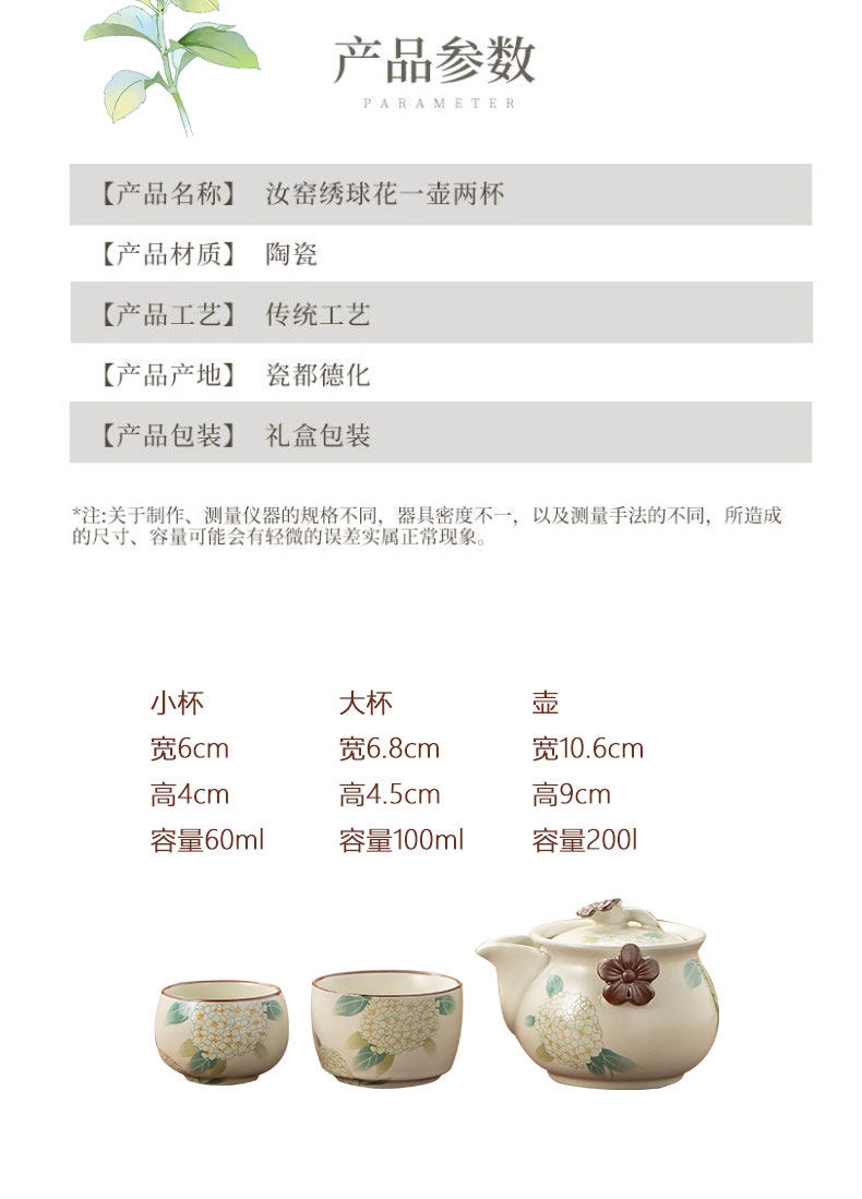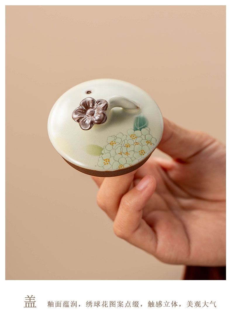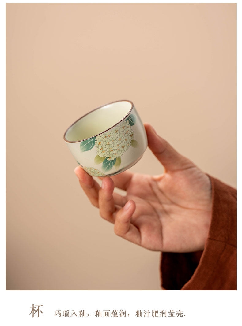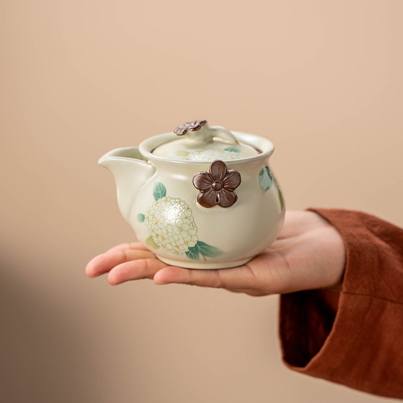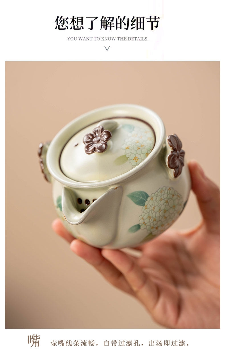 壶嘴线条流畅,自带过滤孔,出汤即过滤;釉面蕴润,绣球花图案点缀,触感立体,美观大气;玛瑙入釉,釉面蕴润,釉汁肥润莹亮