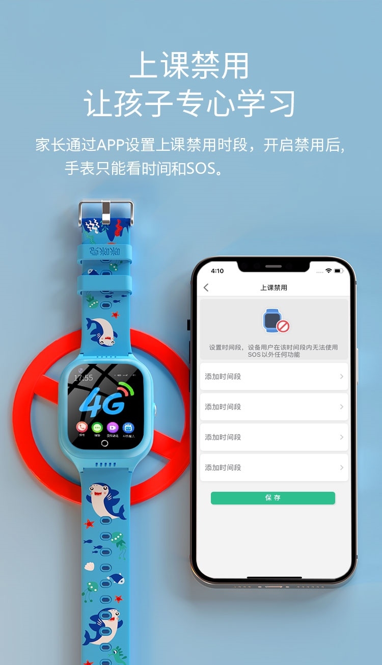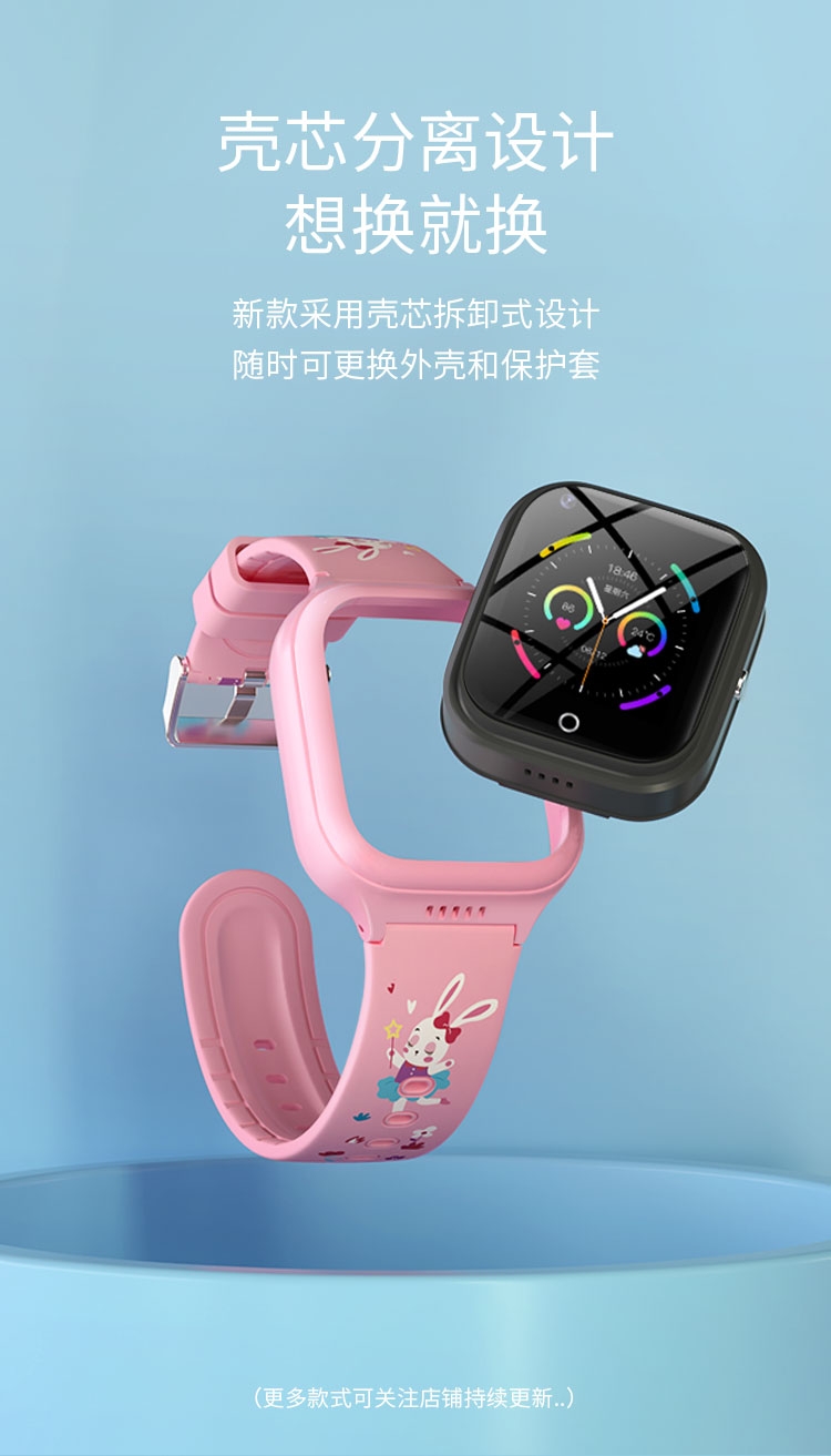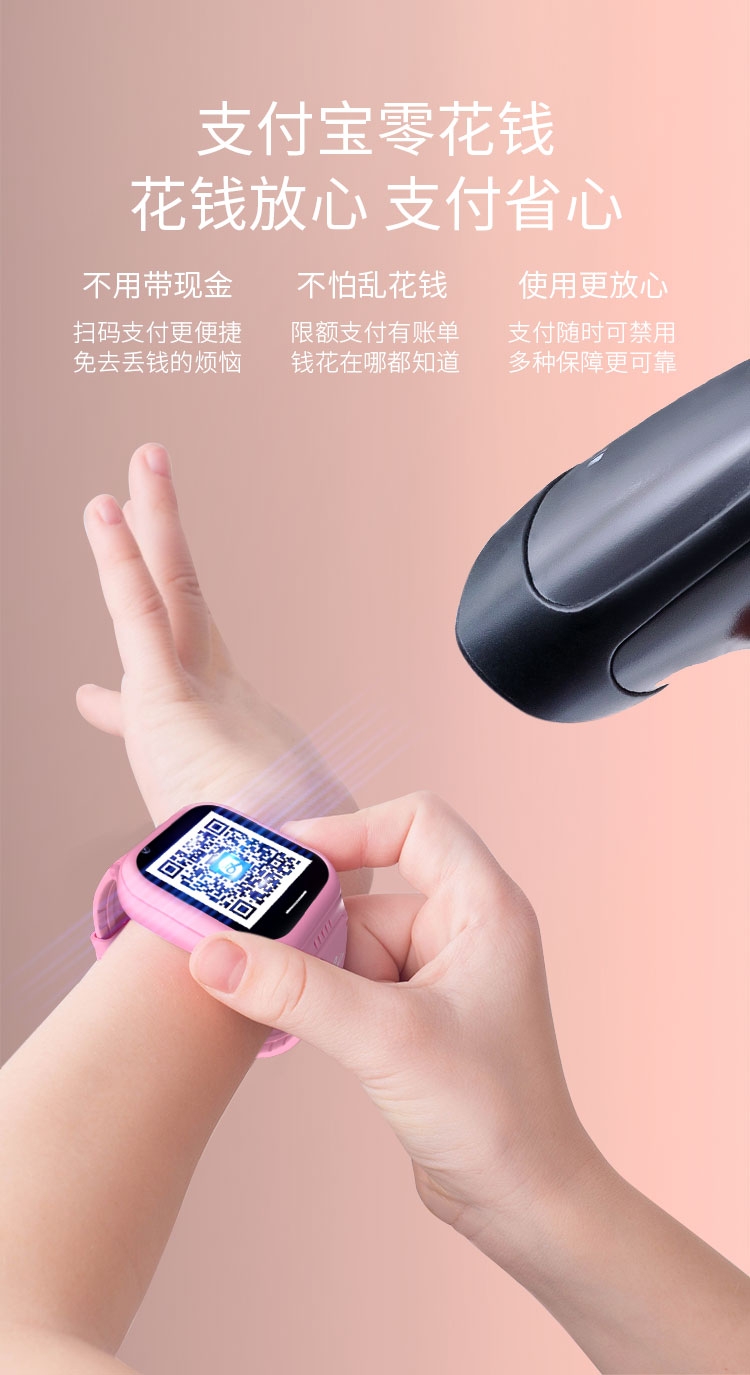 壳芯分离,双重选择,可戴手上可挂脖;两种表带,随心换;手表手机互通电话和视频通话 ;支付宝扫码支付更便捷;上课禁用,专心学习