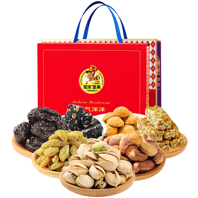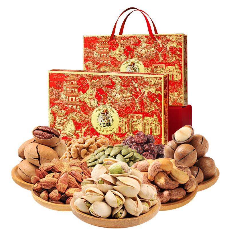 如水坚果全球原产地直采,只挑 选高等级高品质原材料;6种坚果炒货+2种蜜饯 果干+2种坚果酥糖;“大吉”字为魂,海涛纹为 韵,融入东方传统色彩