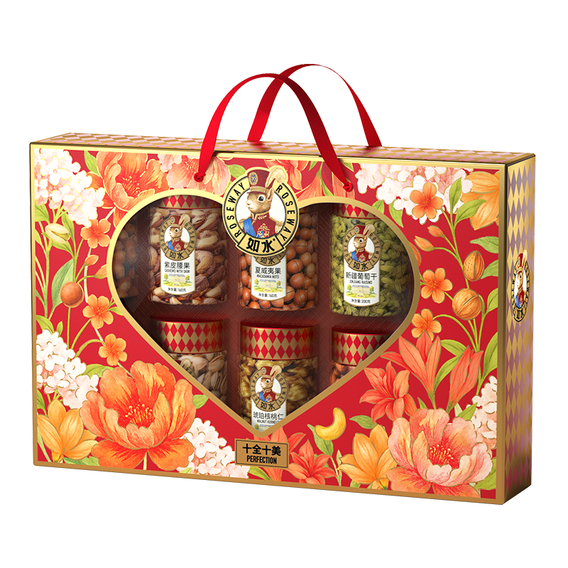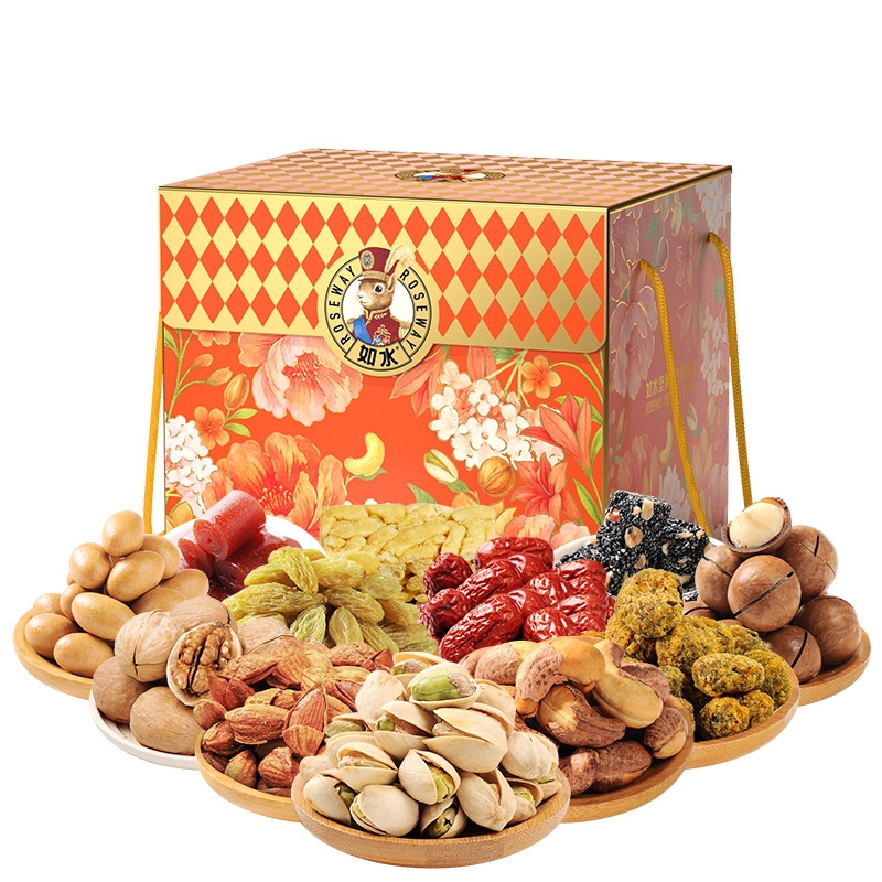 如水坚果全球原产地直采,只挑选高等级高品质原材料;7种坚果炒货+3种水果干制品+1种酥糖+1种沙琪玛;珍果系列以海棠、百合等象征富贵 吉祥的花卉为灵感